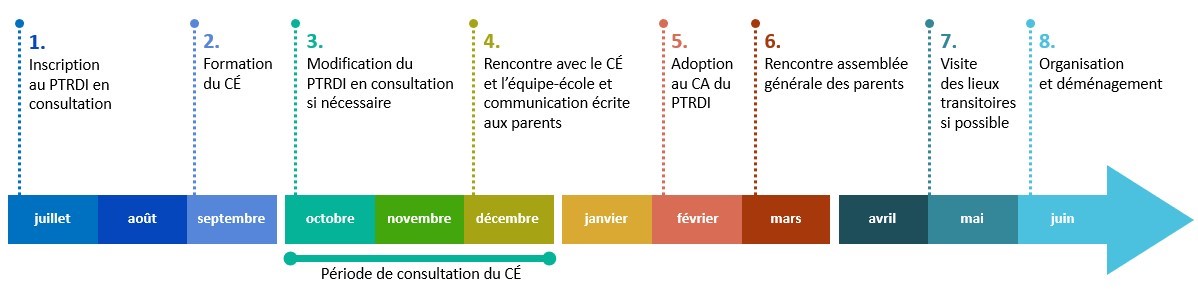 Cette ligne du temps illustre les étapes en cours et celles à venir en vue du projet de délocalisation de l’école Saint-Jean-de-Brébeuf.